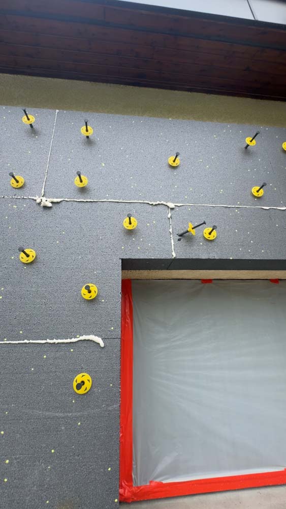 Système d’isolation polystyrène calé-chevillé et sous enduit mince, avec une finition taloché fin d’un grain de 1,5 mm.